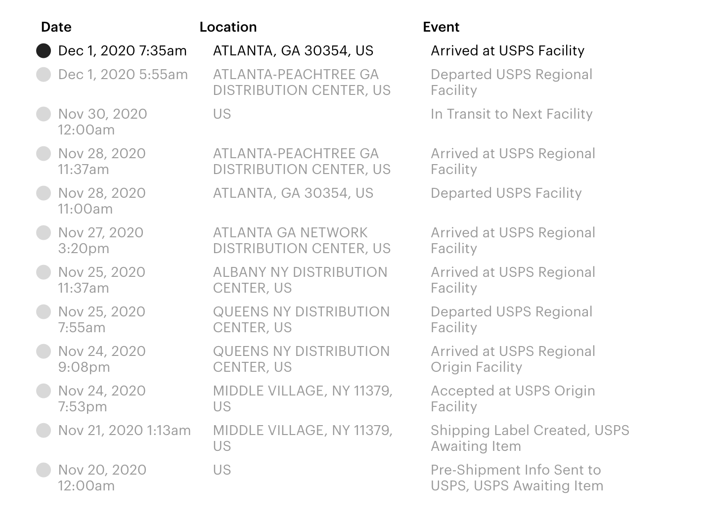 2020 826 am Arrived at USPS Regional Facility SOUTHERN CT DISTRIBUTION CENTER December 11 2020 758 pm Arrived at USPS Facility. 240 PEACHTREE ST NW BSMT. Comments sorted by Best.